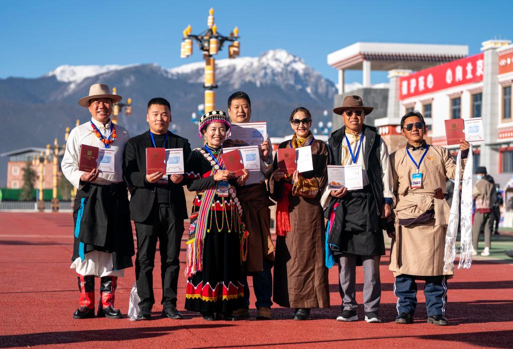 ↑ 参加丽香铁路开通仪式的嘉宾在香格里拉站站前广场手持纪念车票合影(2023年11月26日摄)。
