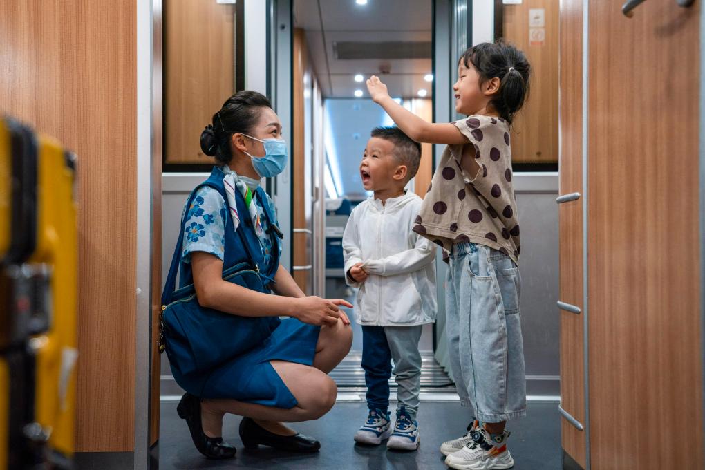 ↑ 依波逢(左一)在D887次列车上与小朋友互动(2023年7月16日摄)。