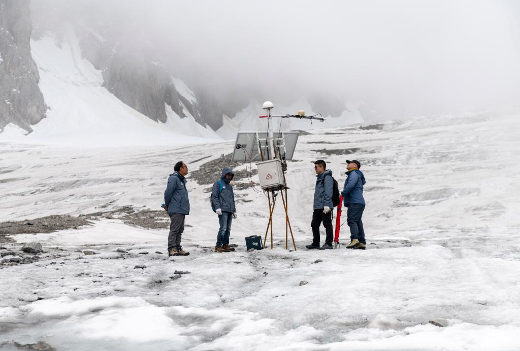 ↑ 玉龙雪山站科研人员在白水河1号冰川上查看冰川监测设备,受冰川运动影响,监测设备支架已经变形(2023年6月16日摄)。
