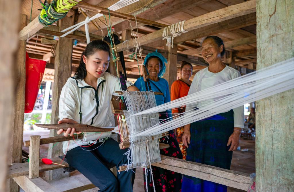 ↑ 依波逢的外婆(右一)指导依波逢织布(2023年7月16日摄)。