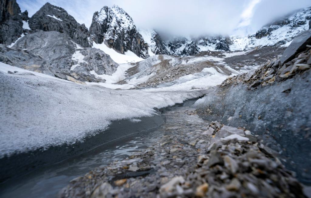 ↑ 玉龙雪山白水河1号冰川融水形成的溪流(2023年6月16日摄)。