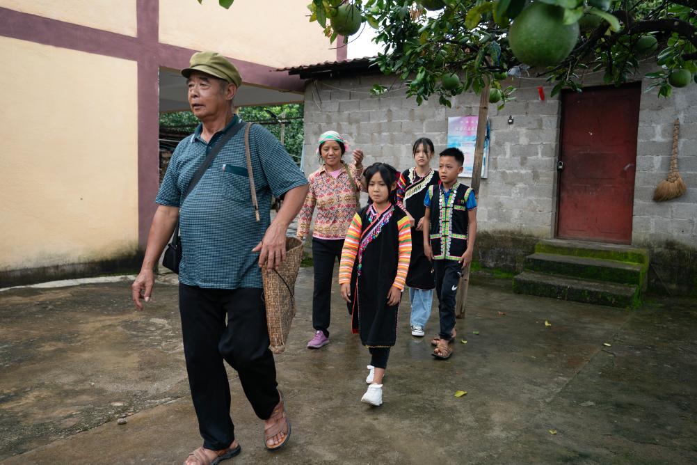 ↑ 张普忠(左一)带领妻子和孙辈出门准备进山(2023年7月23日摄)。