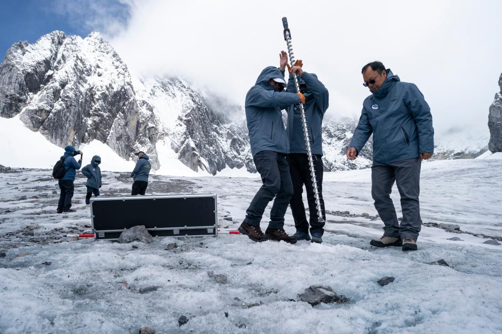 ↑ 玉龙雪山站站长王世金(右一)和团队成员在白水河1号冰川冰面打钻准备插入花杆(2023年6月16日摄)。