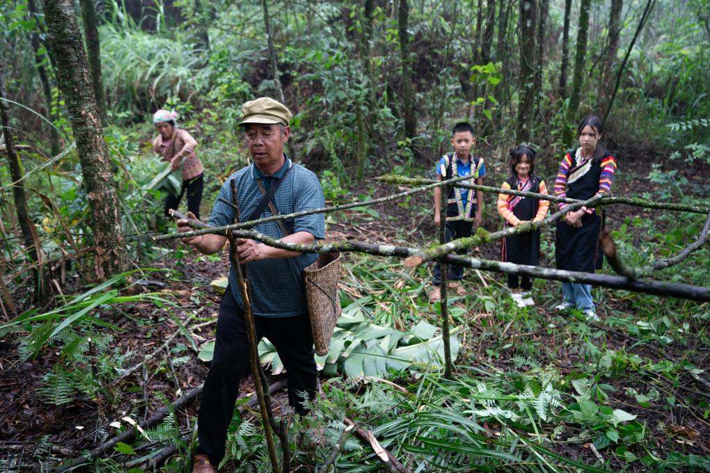 ↑ 张普忠(左二)给孩子们演示以前的苦聪人如何搭建房屋(2023年7月23日摄)。