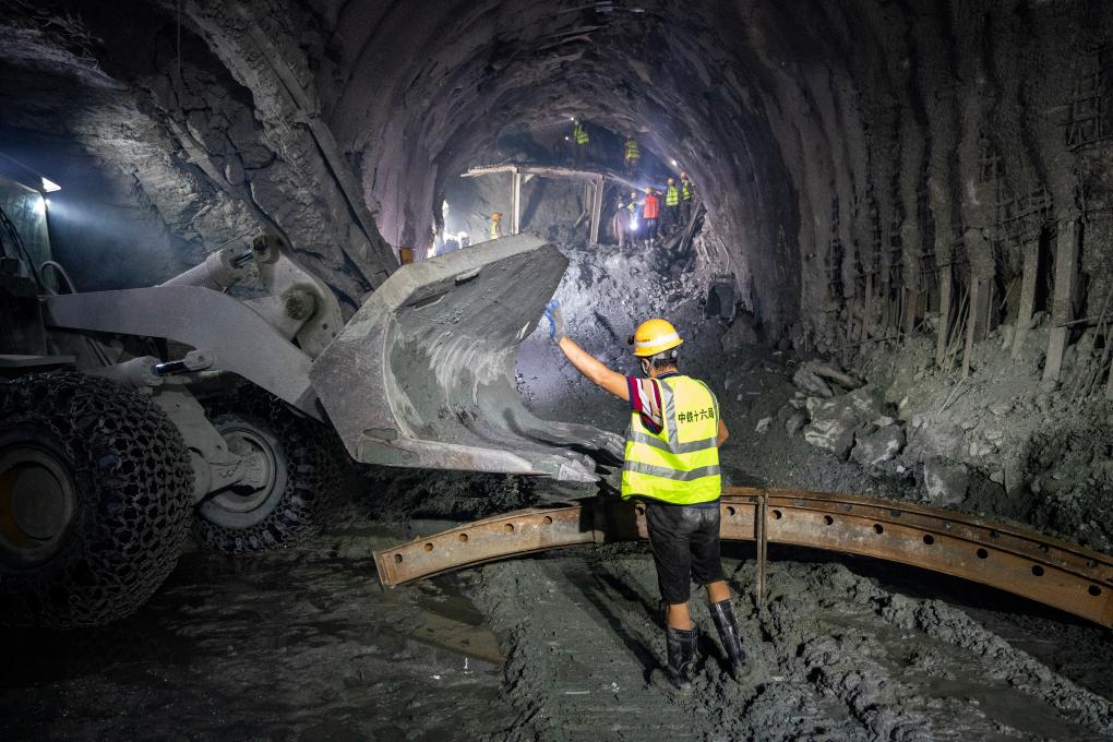 ↑ 一名工人在哈巴雪山隧道内指挥装载机移动,受高地应力影响,隧道内壁出现变形(2022年7月27日摄)。