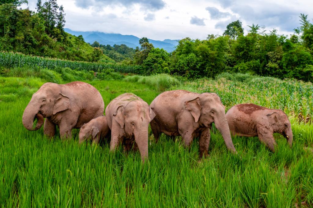 ↑ 一群野生亚洲象在江城县一处稻田觅食(2023年7月19日摄)。