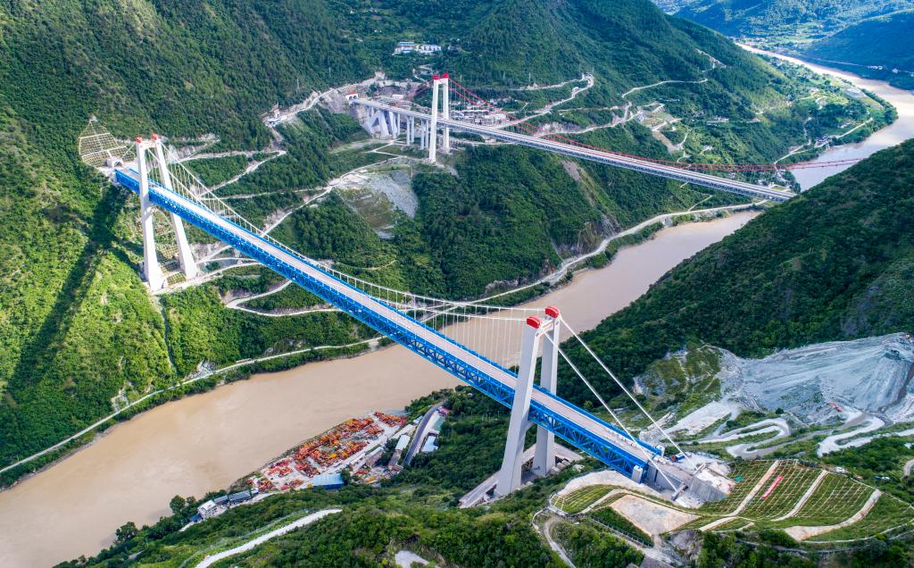 ↑ 丽香铁路金沙江特大桥,远处是丽香高速公路桥(2022年7月26日摄)。