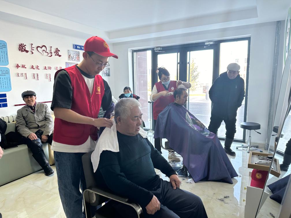 志愿者们正在为老年人理发。新华社记者王雪冰 摄