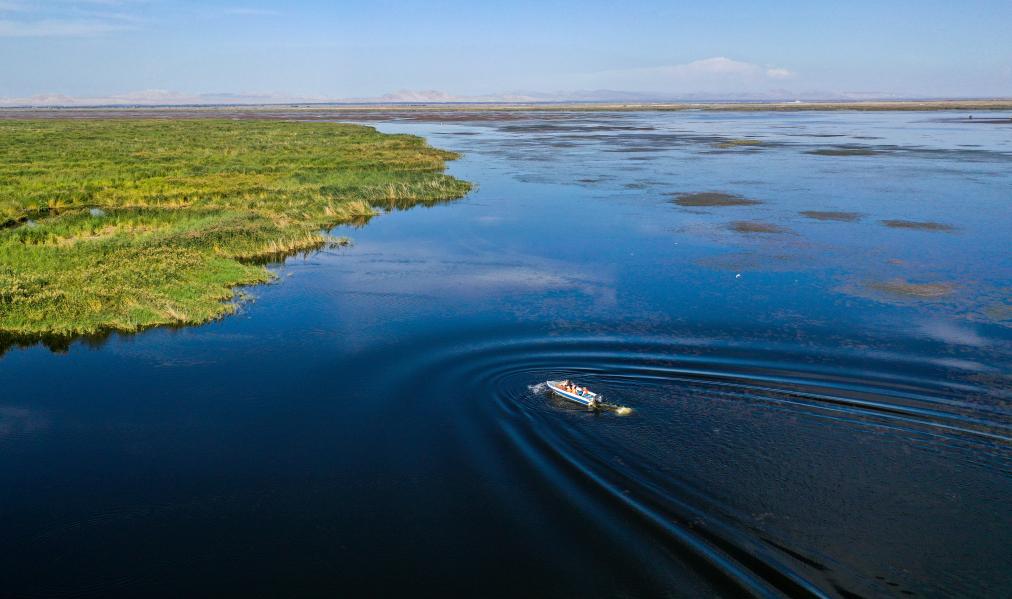 在乌梁素海湖面上,内蒙古农业大学的研究生武蓉、冯琛和刘莹慧乘坐快艇去采集湖水样本(2023年9月15日摄)。