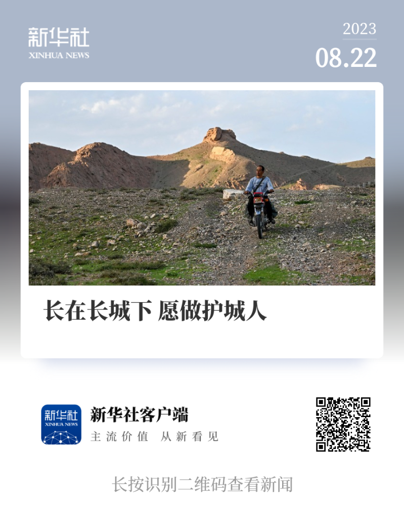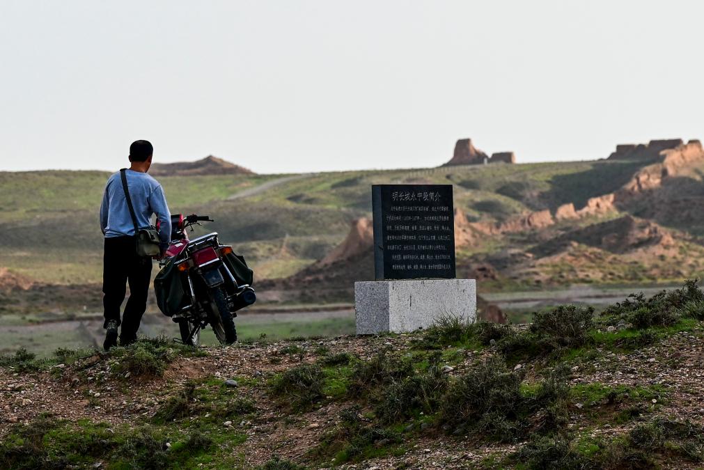 董海宁骑摩托车巡查贺兰山沿线的明长城永宁段(2023年8月20日摄)。