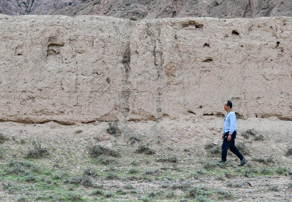 董海宁徒步巡查贺兰山沿线的明长城永宁段(2023年8月20日摄)。