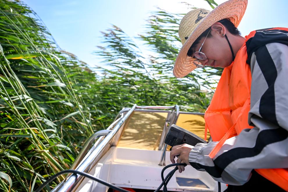 在乌梁素海湖面上,内蒙古农业大学的研究生武蓉在测量水质(2023年9月15日摄)。