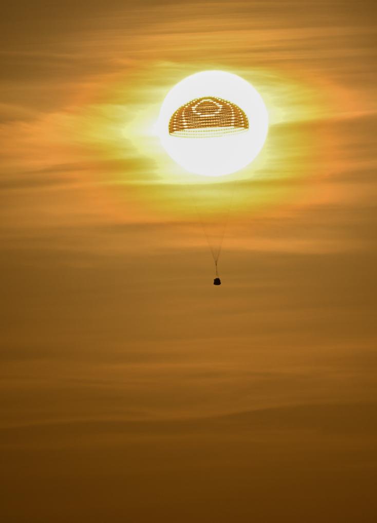 而返回舱回收报道,更是充满了不确定性。在前期策划阶段,我设想将返回舱着陆与朝阳定格在一起的画面,因为神舟十六号返回舱开伞时,可能正是太阳刚从地平线出来不久。抵达现场后,太阳已经高出地平线一段距离了,微风吹动着返回舱向远处飘去,我没有再犹豫,找准位置后,果断调整焦距摁下了快门。