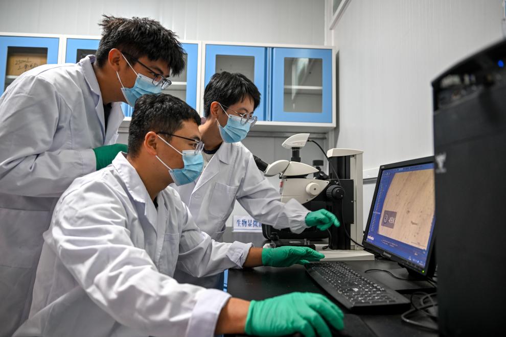 武蓉(右)和同学用显微镜观察水样中的微塑料(2023年9月14日摄)。