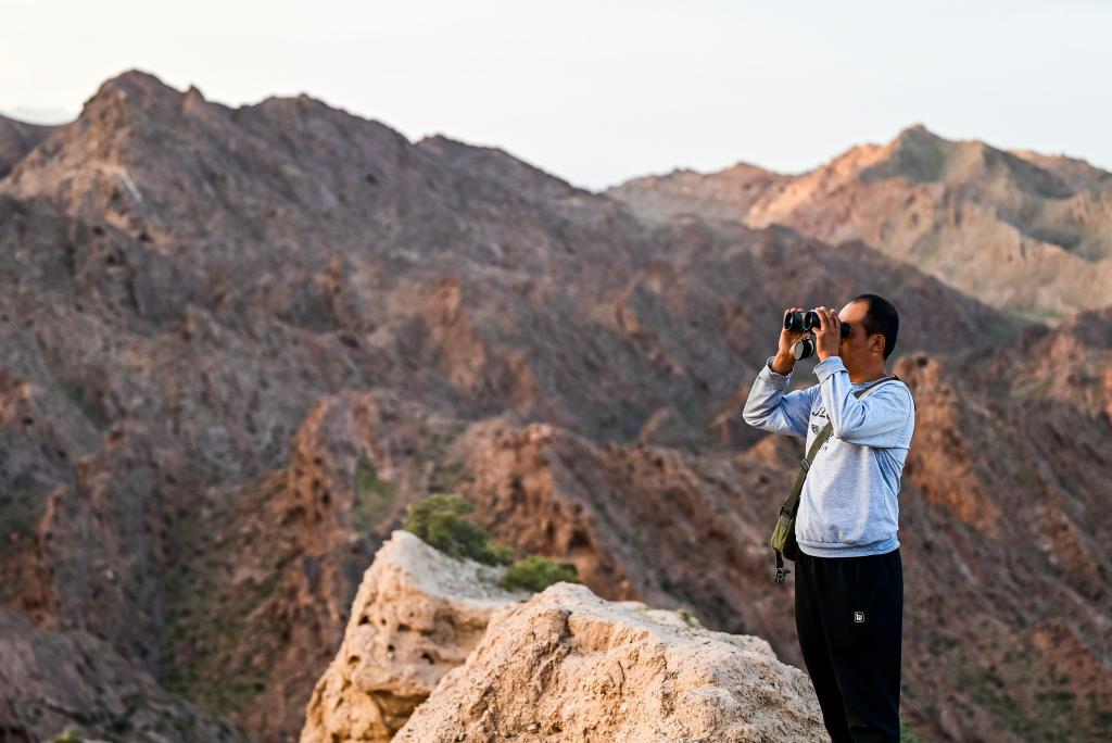 董海宁利用望远镜观察远处长城情况(2023年8月20日摄)。
