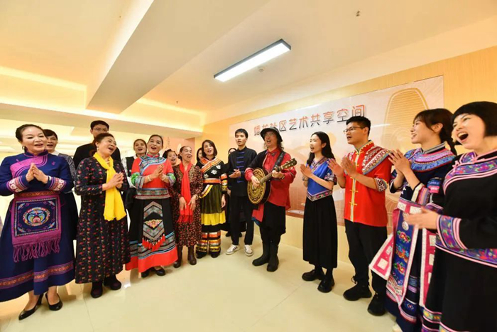 ▲在蟠龙社区新时代文明实践站,居民在唱山歌。新华社记者 黄孝邦摄