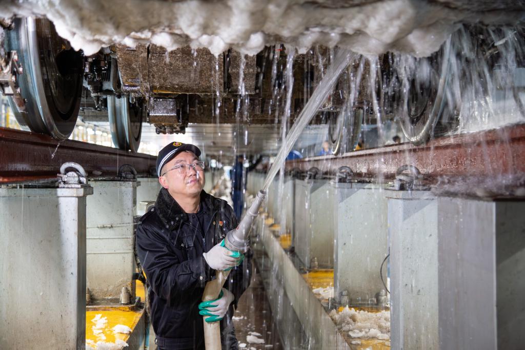 在山东青岛北动车所,机械师刘伟民用温水清除列车下的积冰:“动车组运行在山区或气温较低的区段,未融化的积雪及雨水会附着在动车组走行部导致结冰。我和同事会根据需要增加排班,保障列车安全。”