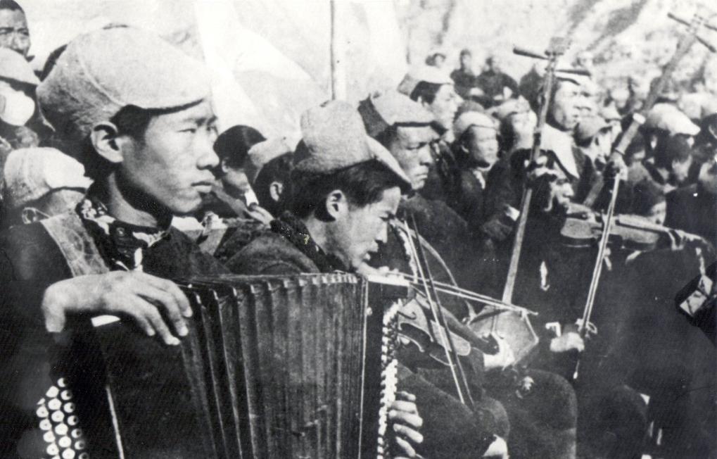 1943年,鲁艺秧歌队在演出中,前左一为《春节序曲》的作者李焕之。新华社发(延安鲁艺文化中心供图)