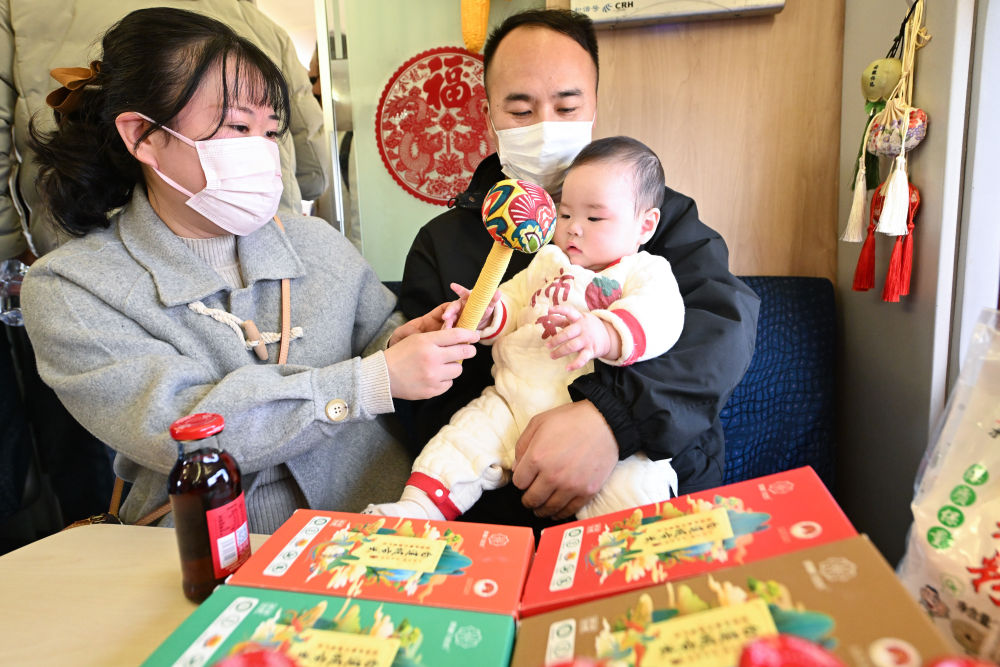 1月29日,G7578次列车上,旅客携家带口来“逛”市集。新华社记者季春鹏 摄