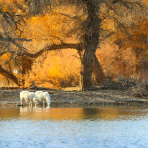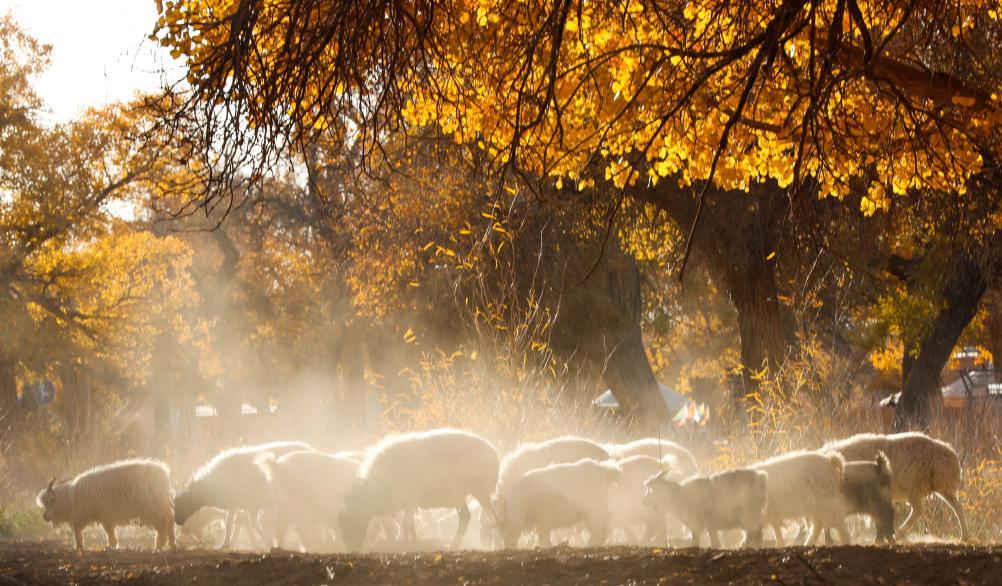 深秋的额济纳,美丽的胡杨林正值金黄。这里的羊群穿梭在林间,不时来到湖边饮水,不时前往林间觅食,一幅美丽的秋日画卷徐徐展开。