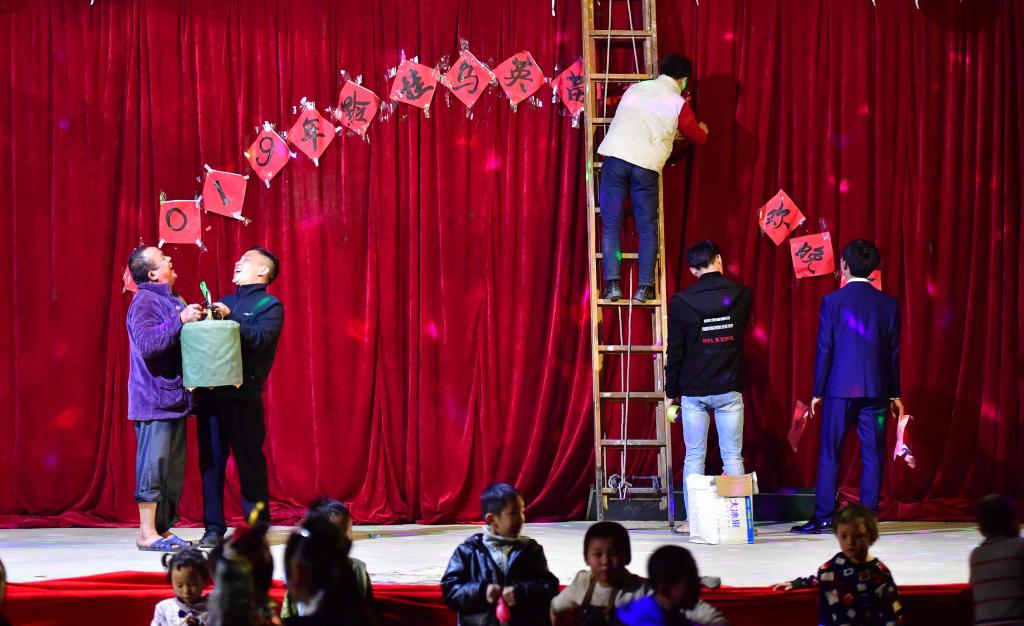 2019年2月7日,乌英苗寨的年轻人布置舞台,准备举办新春联欢晚会。苗年和春节,是乌英苗寨两个最隆重的节日。苗年为腊月初的十几天,每年这个时候,外出的人们便陆续返乡,吹芦笙、跳苗舞、品百家宴,庆祝节日。过完苗年,乌英苗寨里的芦笙苗舞并不停歇,人们又进入“春节时间”。