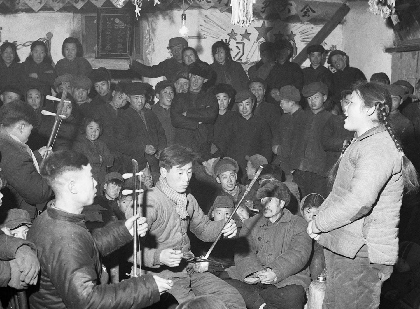 河北省卢王庄公社桃园大队社员在1965年春节前夕举行联欢晚会。这是社员丁桂华(右)在演唱歌曲《李双双》。