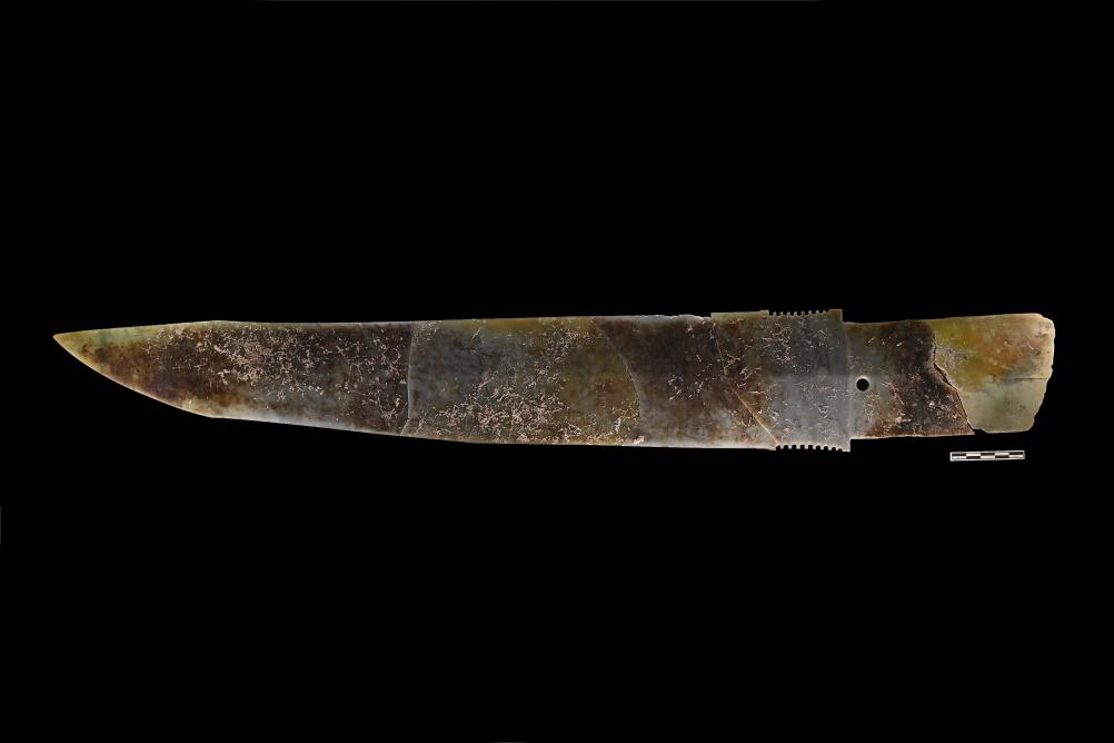 郑州商都书院街墓地M2墓葬出土的玉戈。