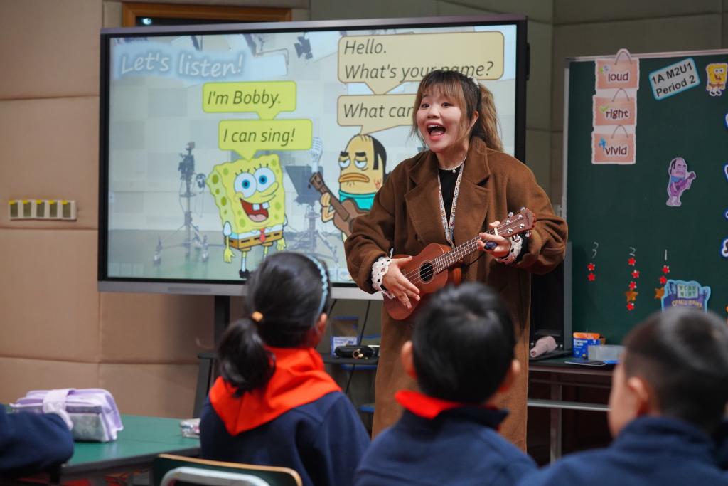 来自上海市青浦区教师进修学院附属小学的周燏玫老师,正在给浙江省嘉善县吴镇小学学生们上英语课。(受访单位供图)