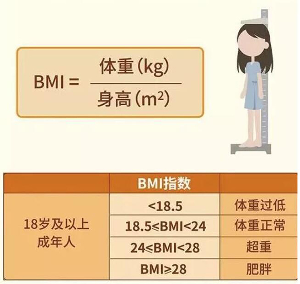 其计算公式为:BMI=体重(kg)/身高(m)²;通常18.5≤BMI<24,为正常体重。当24≤BMI<28,为超重;当BMI≥28,为肥胖。如果BMI<18.5,则为体重过低。