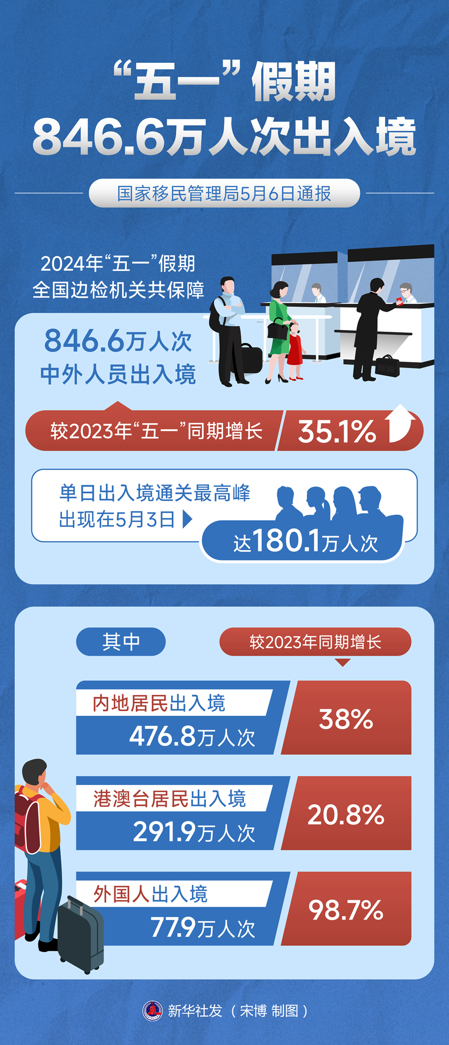 新华社北京5月6日电(记者 任沁沁)国家移民管理局6日通报,今年“五一”假期全国边检机关共保障846.6万人次中外人员出入境,较2023年“五一”同期增长35.1%,单日出入境通关最高峰出现在5月3日,达180.1万人次。其中,内地居民出入境476.8万人次,较2023年同期增长38%;港澳台居民出入境291.9万人次,较2023年同期增长20.8%;外国人出入境77.9万人次,较2023年同期增长98.7%。