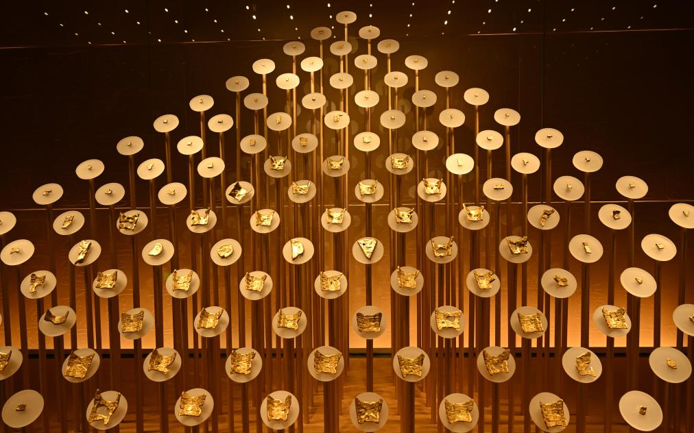 《管子·轻重甲》载:“楚有汝、汉之黄金”。楚地盛产黄金,货币制度发达。158枚楚金币布成的“金山”如同暗夜繁星,吸引了众多游客的目光。楚金币是博物馆特色藏品之一,有龟版形、楔形和圆形,并印有“郢爰”“陈爰”等印记。