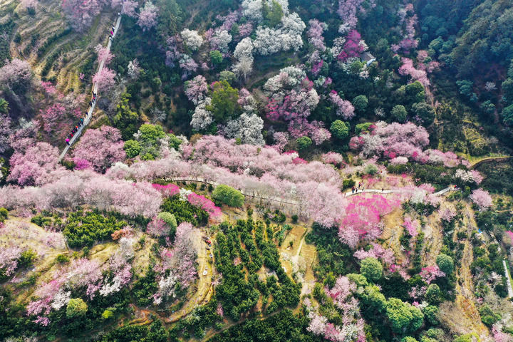 2023年2月25日,游人在安徽省黄山市歙县雄村镇卖花渔村赏花(无人机照片)。新华社发(樊成柱摄)