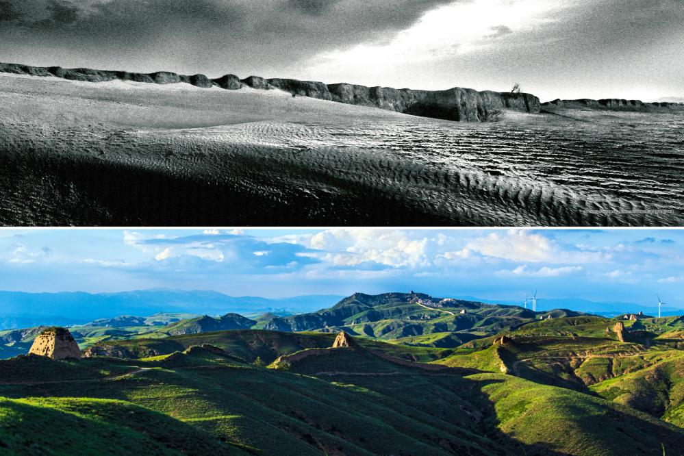 上图为:治理前,山西省右玉县随处可见的荒凉沙地(资料照片);下图为:2021年7月13日拍摄的山西省右玉县右卫镇的景色(新华社发 徐吉摄)