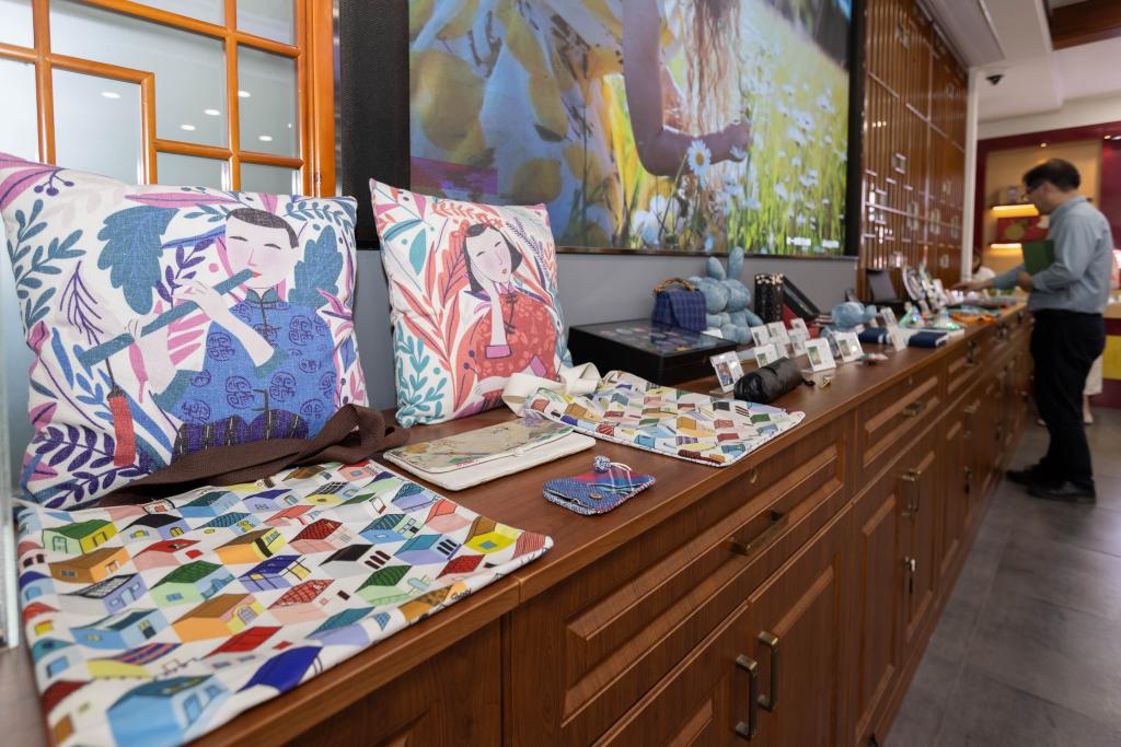 人们在选购枫泾农民画衍生的系列文创产品。新华社记者王翔摄