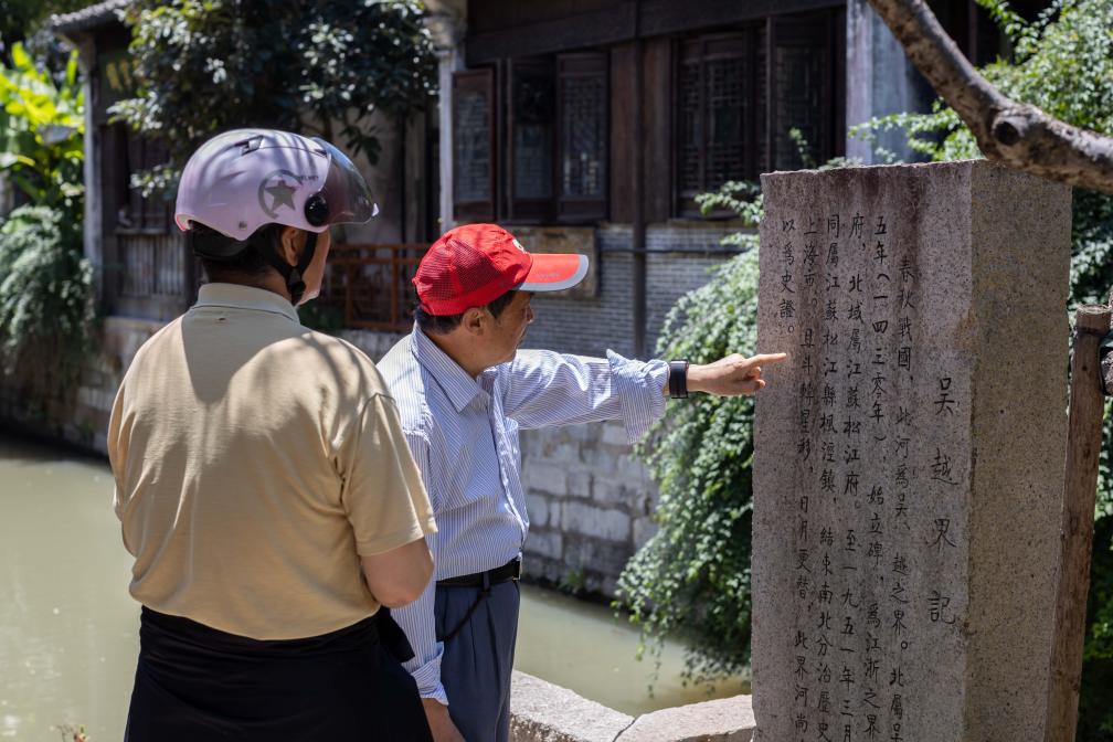 人们在枫泾古镇的吴越界石碑旁驻足观看。新华社记者王翔摄