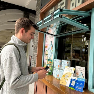 4月11日,来自德国的留学生理查德在杭州西湖边一家商铺使用支付宝扫码支付。新华社发