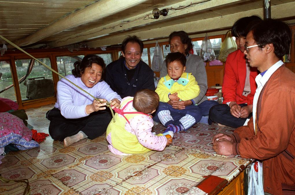 1997年, 浙江余杭老船民钱盛祥(左二)一家四代住在船上,古老的大运河成为他们一家生活的唯一指靠。