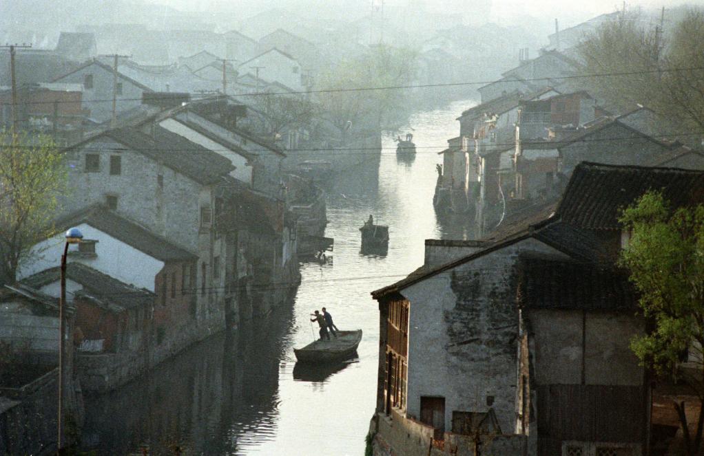 1992年,浙江德清的渔民们在古运河上划着小船去珍珠养殖场育珠。