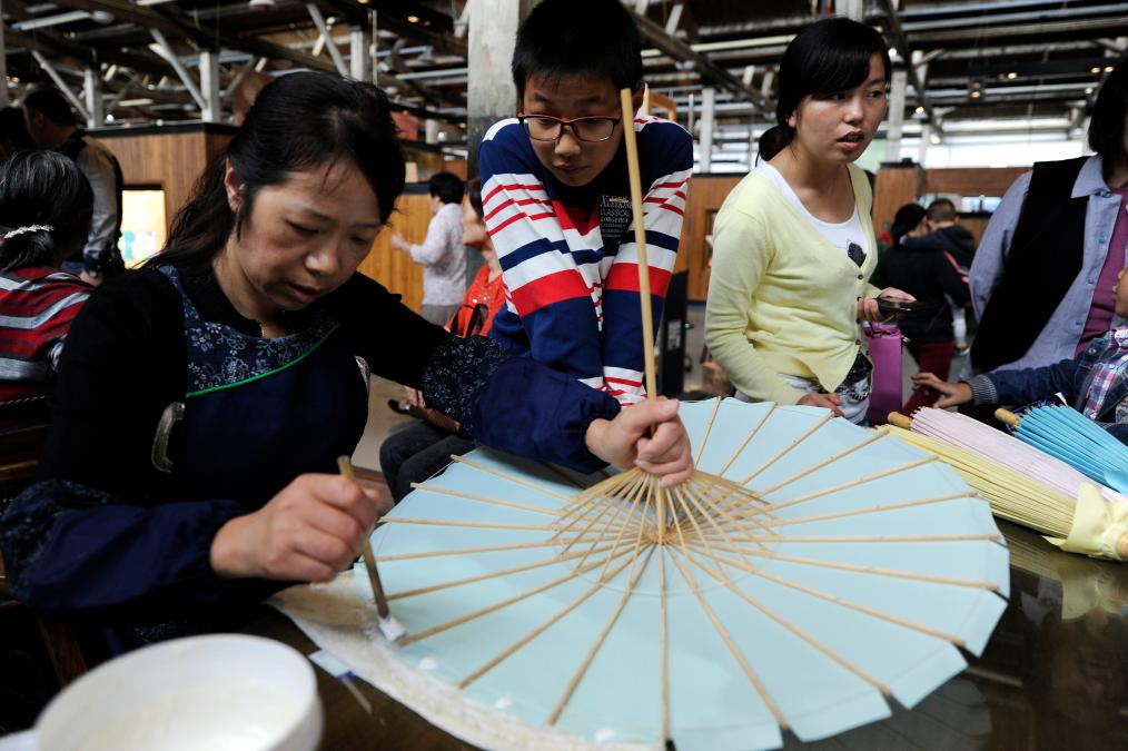 2014年10月18日,游客和市民在浙江杭州举办的2014中国大运河庙会上参观西湖绸伞制作技艺展示。