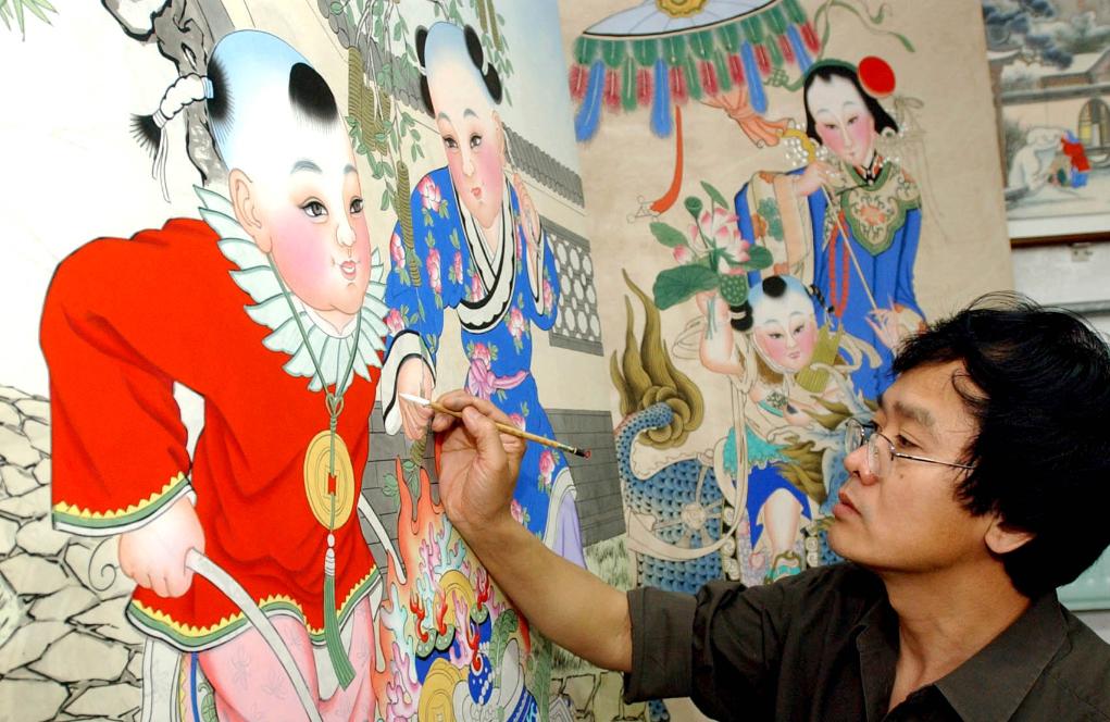 2003年,天津杨柳青“年画张”画店画师在绘制年画。