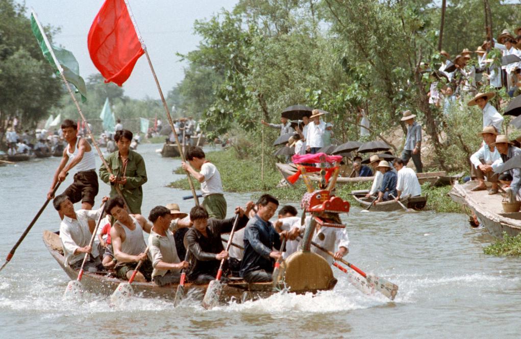 1985年,人们在浙江杭州城外大运河上参与龙舟竞渡。