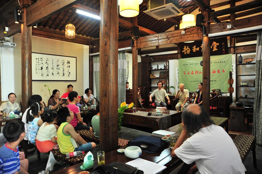 2013年7月13日,书友们在浙江杭州富义仓讲述晒书的故事。清末时期修建的用于储存货物的“富义仓”是运河杭州段主干道沿线唯一一个保存基本完好的仓库码头。