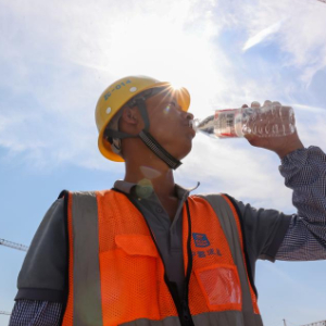 6月18日,在江苏省无锡市奥体三期项目施工现场,中建二局工人在喝水解暑。新华社发(朱吉鹏 摄)