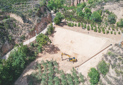 在陕西省榆林市绥德县辛店沟水土保持科技示范园,工程人员在沟壑中进行淤地坝除险加固和提升改造。新华社记者 李 贺摄