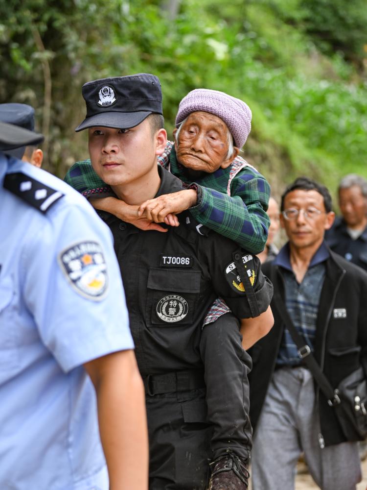 7月21日,在四川省雅安市汉源县马烈乡新华村,救援人员在转移受灾群众。 新华社记者 王曦 摄