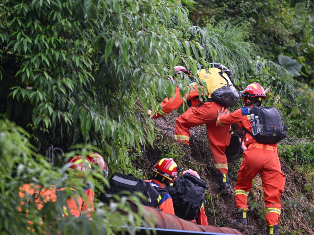 7月21日,在四川省雅安市汉源县马烈乡新华村,消防救援人员前往搜救现场。 新华社记者 王曦 摄