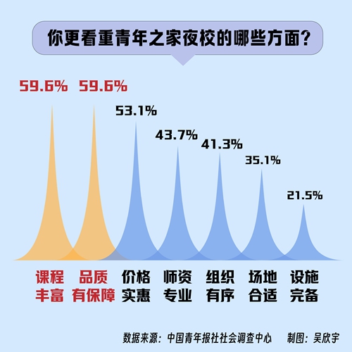 日前,中国青年报社社会调查中心联合问卷网(wenjuan.com),对1342名青年进行的一项调查显示,对于青年夜校,课程更加丰富和品质有保障是受访青年最为看重的方面,获选率均为59.6%。61.0%的受访青年觉得参加夜校可以提升个人技能。