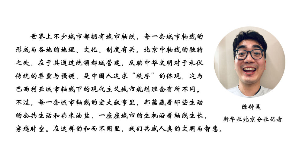 在北京的中心,城市的中轴线如一把标尺,标注着中国发展的进度。在巴西利亚,整个城市以“飞机”形状为蓝图,城市中心轴线代表机身,两翼则是城市的住宅和商业区域。城市中轴线是巴西利亚的行政和文化中心。沿线的绿化带、公园和广场为市民提供了休闲和娱乐的场所,体现着城市规划中的人文关怀和环保理念。