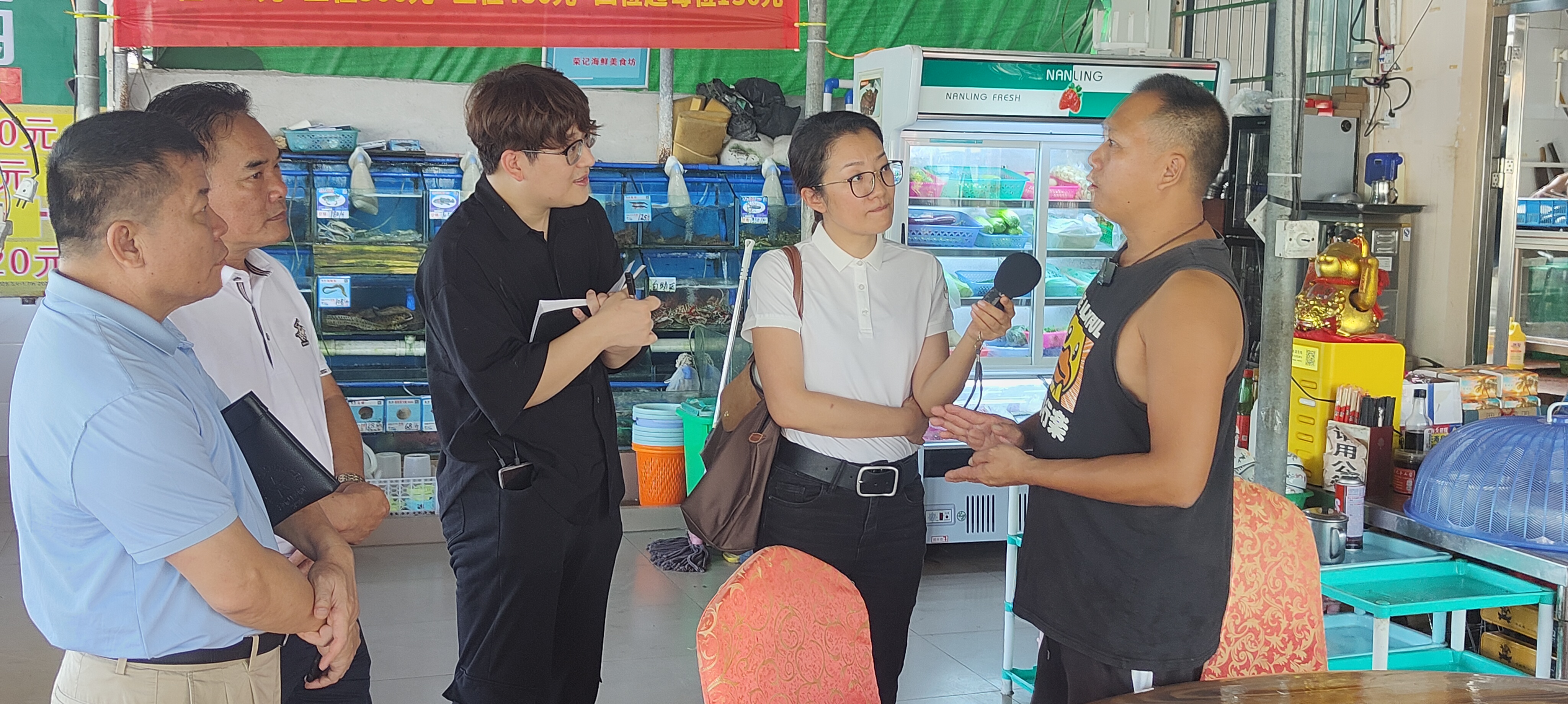 【工作照】三亚传媒影视集团吴跃超(右3)、2024年5月9日、三亚市人民街、采访疍家渔民郑勇其
