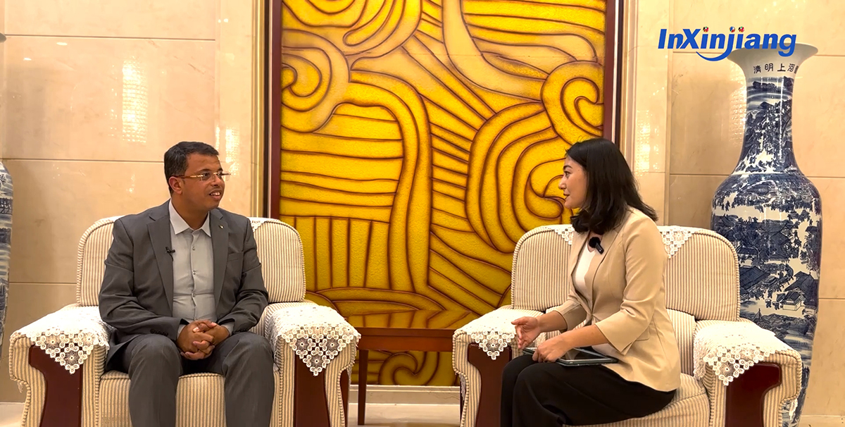 阿尔及利亚宗教和募捐事务部合作与对外关系司副司长穆罕默德·萨耶布(左一)就新疆少数民族文化保护传承和发展等话题接受《InXinjiang》栏目专访。